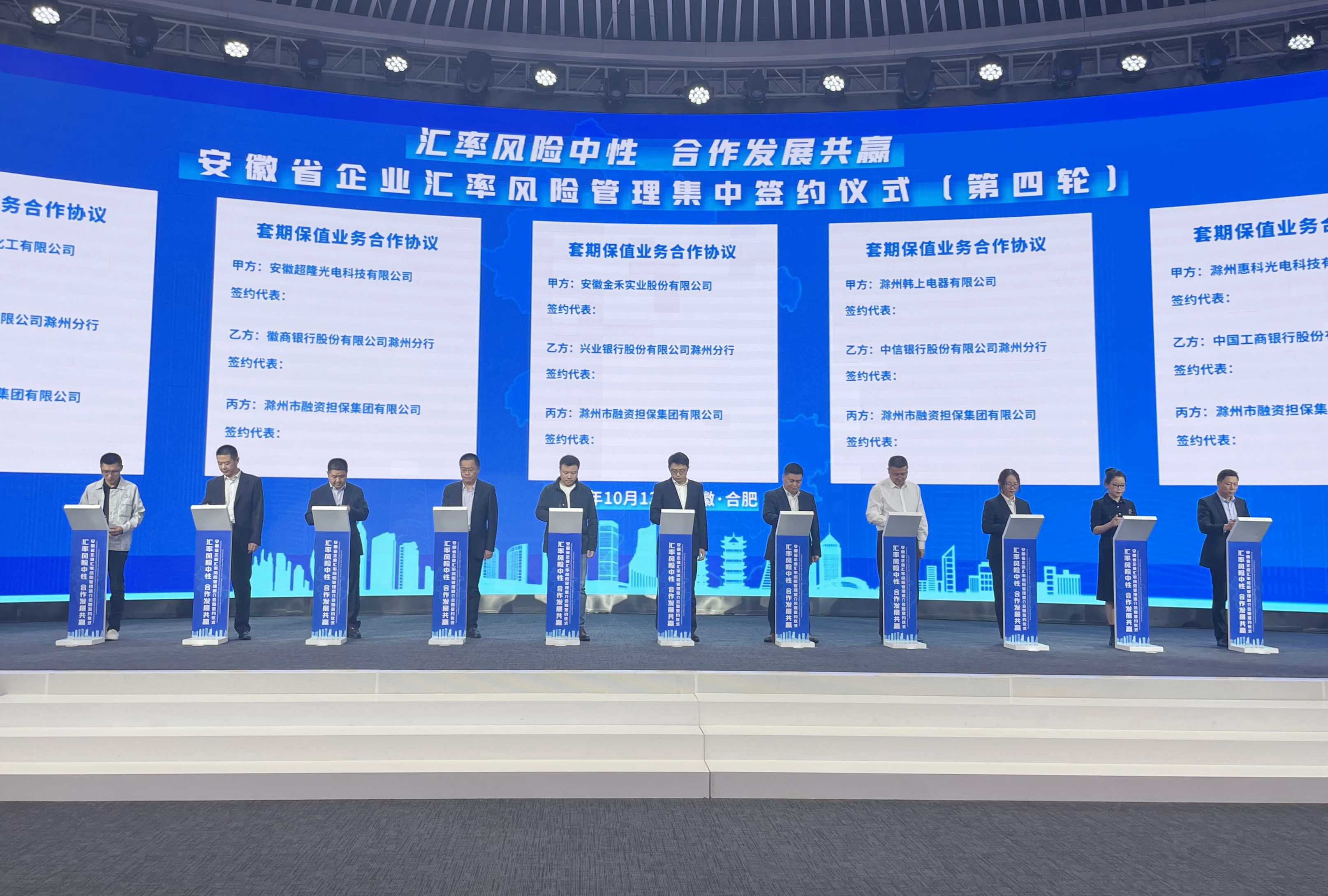 活動(dòng)中,工商銀行總行匯率風(fēng)險(xiǎn)管理專家牛麗群做匯率風(fēng)險(xiǎn)中性主題宣介,安徽省興泰融資擔(dān)保集團(tuán)有限公司負(fù)責(zé)人以及2家企業(yè)代表分別做匯率風(fēng)險(xiǎn)分擔(dān)政策講解和匯率風(fēng)險(xiǎn)管理經(jīng)驗(yàn)分享。市擔(dān)保集團(tuán)與滁州惠科光電科技有限公司等10家外貿(mào)企業(yè)及合作銀行進(jìn)行外匯套保業(yè)務(wù)合作集中簽約。