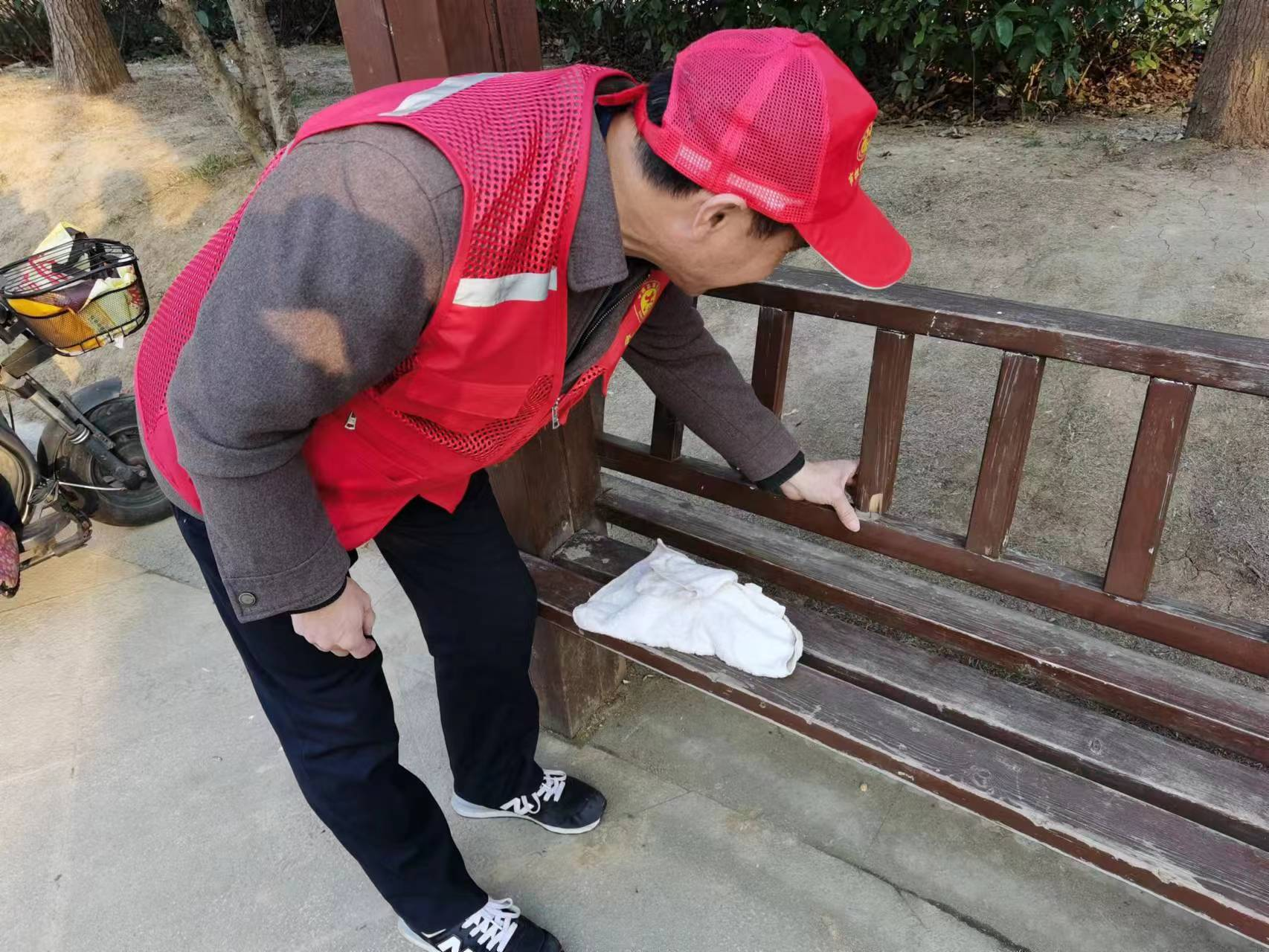 黨員志愿者在幫助小區(qū)維修損壞的長(zhǎng)椅